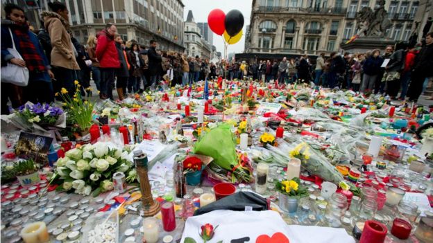 A minute's silence was held earlier at a makeshift shrine outside the Brussels bourse, attended by Belgium's King Philippe, the prime minister, other ministers and hundreds of people.